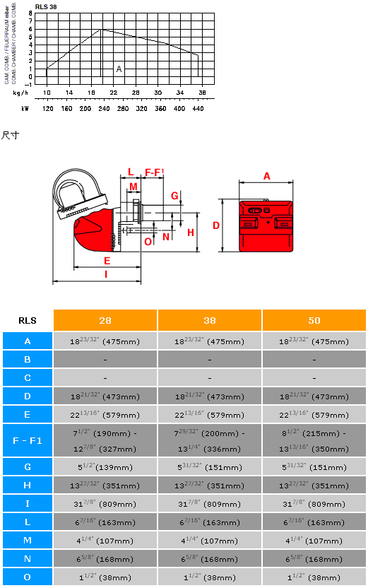 系列 型号 发热量(KW) 控制方式 燃料种类 电源 油泵电机功率(W) 风机电机功率(W) 一段火 二段火 RLS 38 116 232-442 二段火 轻油 天然气/液化气 1ph * 220V * 50Hz 3ph * 380V * 50Hz 90 420