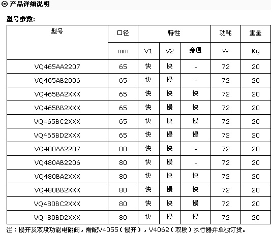 VQ465、VQ480系列系列电磁阀是Honeywell公司最新开发的大口径组合A级电磁阀,可用于各种常规气体燃料。均为法兰连接,包括快开快关,慢开快关;单段、双段控制;流量调节等各种类型可供选择。阀门关闭时间<1秒。最大允许燃气管路压力:<200mbar。使用环境温度:-15°C...+60°C。电磁阀燃气入口处均装有最低燃气压力保护开关。防护等级:IP54,可选IP65。